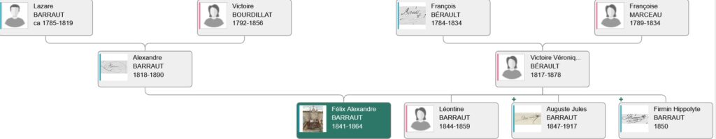 Félix Alexandre BARRAUT est descendant à la 4è génération de Simon BARRAUT (né Joux-la-Ville 1712-dcd Essert 1793), charron et recteur des écoles d’Essert.
