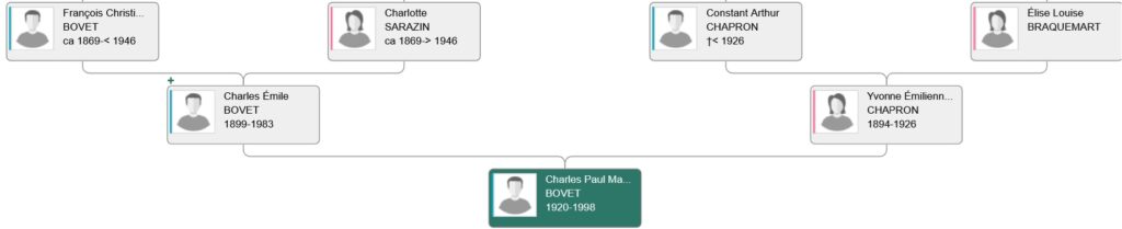 – Charles Paul Marcel BOVET [né à Paris 11 le 18 06 1920–décédé à Blois (41) le 28 05 1998] fils né du 1er mariage célébré à Paris 11 le 07 10 1919 de Charles Émile BOVET d’avec Yvonne Émilienne CHAPRON (née le 05 11 1894 à Paris 10 où elle est décédée le 24 04 1926), fille de Constant Arthur CHAPRON & Élise Louise BRAQUEMART.