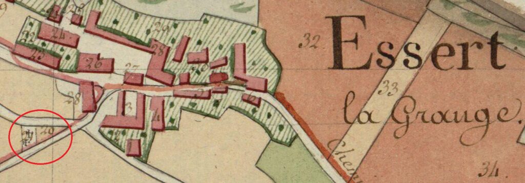 A l’origine, le cimetière d’Essert était plus petit que l’actuel. Il ne comprenait que la parcelle du fond. Cela est visible sur le cadastre napoléonien de 1806 où le village est nommé Essert la Grange. La partie représentant le cimetière est indiqué par deux croix pattées.