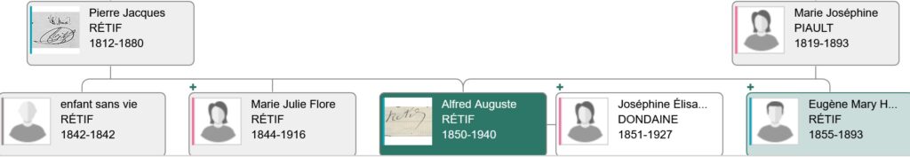 La tombe de Julie RÉTIF, tout comme celle de son frère, mériterait une restauration. Julie est avec son frère Pierre RÉTIF (1811-1880) ce qui nous rapproche le plus de son grand oncle Rétif de la Bretonne. 15 ans séparent le décès de l’écrivain de la naissance de sa petite-nièce Julie RÉTIF dont nous avons une photo, et 5 ans seulement pour Pierre RÉTIF dont il sera question ci après.