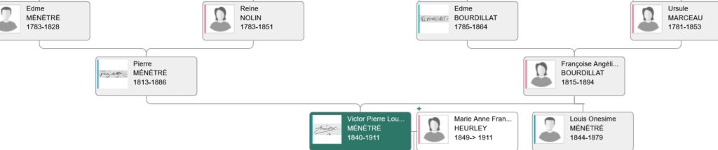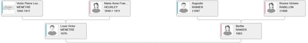 – Louis Victor MÉNÉTRÉ [né à Essert le 21 03 1876–date de décès ignorée], fils de Victor Pierre Louis MÉNÉTRÉ (né à Essert 1840-dcd à Essert 1911 dont la tombe est en [X]) & de Marie Anne Françoise HEURLEY (née à Villiers-la Grange, commune de Grimault 1849–dcd après 1911). Et de sa femme qu’il a épousée à Coulanges-la-Vineuse le 10 02 1902 :