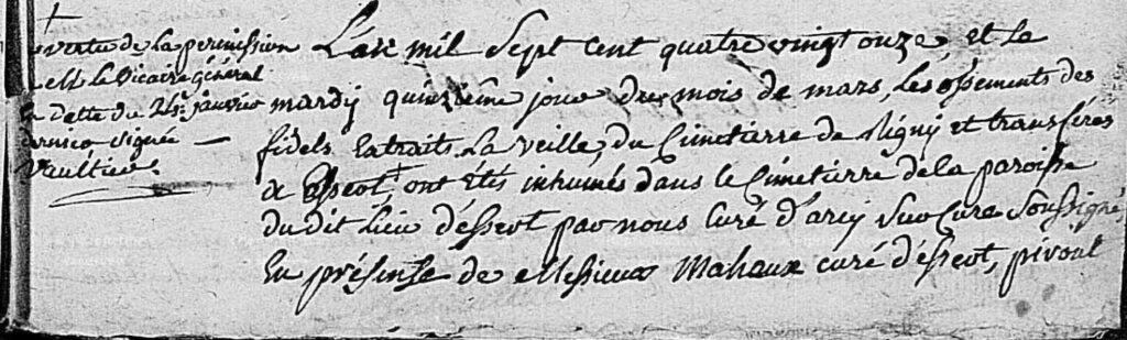 Puis le 14 mars 1791 les ossements furent extraits du cimetière de Reigny et le lendemain transportés et inhumés dans le nouveau cimetière d’Essert.