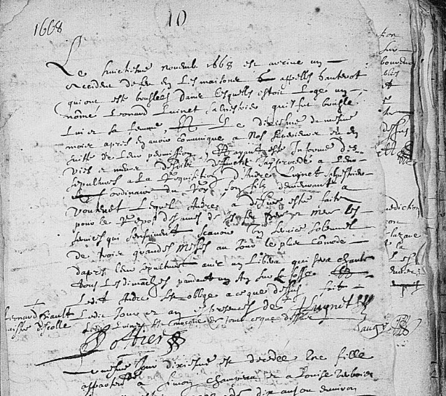 Le huictiesme novemb. 1668 est arrive un accident de feu en les maisons appelles gauterot qui ont este bruslées dans lesquelles estoit logé un nômé Leonard Luinet salpestrier qui y fut bruslé lui et sa femme, et le dixiesme du mesme mois apres en avoir cômunique a nos superieurs et en suitte de leur permission, et ayant este Informe des vies et maleurs desdits desfuncts Jay procedé a leur sepultures a la requisition d’Andre Luynet salpestrier [rature] ordinaire du Roy son fils demeurant a voutenet lequel André a desire estre faite pour le repos des ames de ses pere et mere les services qui sensuivent scavoir un service solennel de trois grandes messes au jour le plus cômode d apres leur sepulture avec un libera qui sera chanté tous les dimâches pandant un an sur la fosse et ledit Andre sest oblige a ce que dessus fait ledit jour et an es presences de Leonard Piault maistre descolle Ledit Luiney sest (mot non compris) [1] de tout ce que dessus » Signé : A Luynet, Pottier [note : curé de Sacy]
