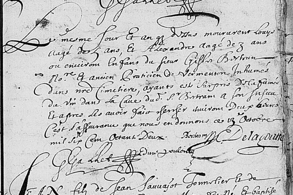 « Le mesme Jour et an que dessus [note : 12 10 1682] moururent Louys aagé de 5 ans, et Alexandre aagé de 3 ans ou environt enfans du sieur Gisles Bertran No.re [Notaire] et ancien Praticien de Vermenton Inhumés dans nre [notre] Cimetiere, ayants esté surpris de la fumée du vin dans la cave dud. Sr Bertrant a son Insceu Et apres les avoir faict chercher environt deux heures. C’est l’assurance que nous en donnons ce 13e Octobre mil six cent octante deux. » Signature de : – Gilles BERTRAND [père des enfants] – Germain GALLET [curé de Vermenton] – DELAGOUTTE [vicaire de Vermenton] – Edme POULEINE [oncle maternel des enfants]