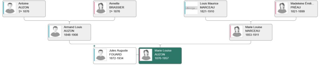 – Marie Louise MARCEAU, fleuriste, [née à Paris-Bercy, Paris 12 le 30 11 1853–décédée à Essert le 02 11 1911], fille de Louis Maurice MARCEAU, cultivateur, vigneron, marchand de vin à Paris, (né à Essert 1821-dcd à Essert 1910) & de Madeleine Émilie PRÉAU, vigneronne, ouvrière (née à Essert 1821-dcd à Essert 1899).