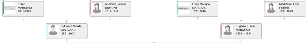 – Édouard Calixte MARCEAU, cultivateur, vigneron, tonnelier, né le 22 09 1851 à Essert–décédé à Essert le 06 04 1901], fils de Edme MARCEAU, laboureur, tonnelier, propriétaire (né à Essert 1811-dcd à Essert 1889) & de Adélaïde Joséphine DUMONT (née à Essert 1819-dcd à Essert 1911). Il a épousé à Essert le 29 11 1879 Eugénie Eulalie MARCEAU (née à Essert le 09 01 1859–décédée après 1911). Elle est la sœur de la femme de Armand Louis AUZON.