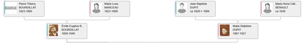 – François Louis BOURDILLAT, cultivateur, tonnelier et vigneron, [né au Val-de-Mercy le 22 04 1829–décédé à Essert le 12 04 1897, fils de Joseph BOURDILLAT (né à Essert 1800-dcd à Essert 1866) & de Félicité COUTURAT (née vers 1799 (acte de naissance introuvable)-dcd à Essert 1854). Il avait épousé à Essert le 06 02 1855 Victoire Véronique MARCEAU, déjà citée et qualifiée dans la filiation de Marie Berthe BOURDILLAT.