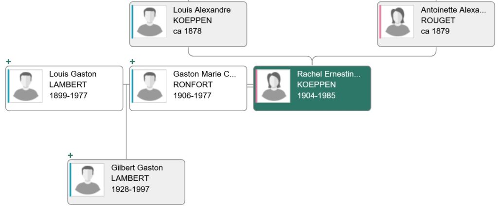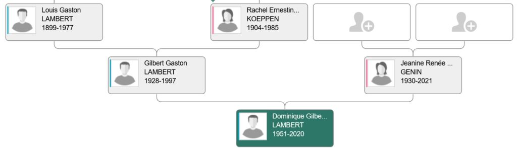 – Gilbert Gaston LAMBERT [né à Paris 20 le 05 08 1928–décédé à Auxerre le 28 01 1997], fils de Louis Gaston LAMBERT (né à Paris 20 en 1889-dcd à Paris 20 en 1977) & de Rachel Ernestine Marguerite KOEPPEN. Cette dernière, remariée est inhumée dans la sépulture « famille Ronfort ». . Sa femme :