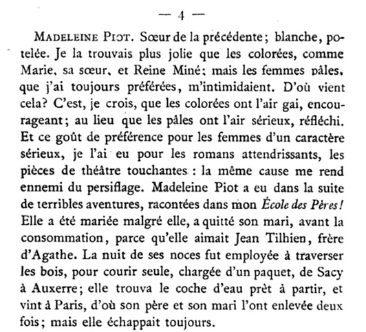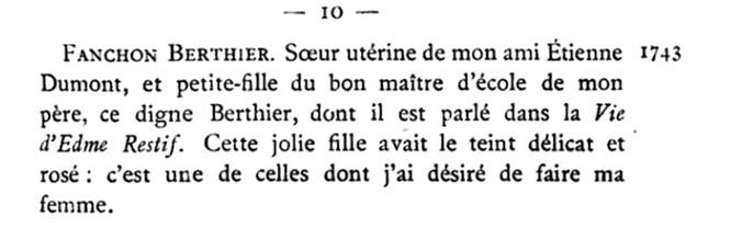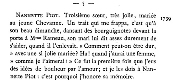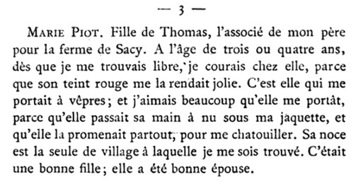 «1738 Je me rappelle que j’étais frappé des louanges qu’on donnait à ma figure ; mais je n’étais sensible à la louange, qu’à proportion de l’amabilité de la personne qui me la donnait, surtout si c’était une jeune fille. L’instinct me parlait pour le sexe différent dés la plus tendre enfance ; tandis que d’un autre côté, les femmes mariées et le tracas du ménage m’inspiraient le plus grand dégoût !… Les jeunes filles que j’ai préférées, étaient celles dont les couleurs ressemblaient à la rose. Thomas Piôt, l’associé de mon père, dans la recette du village, pour les anciens Évêque et Chapitre d’Auxerre, avait quatre grandes filles : Marie, la seconde, avait de belles couleurs ; Madeleine, la troisième, était blanche et potelée ; Nannette, la dernière, régulièrement jolie. Je préférai Marie, ayant un beau fichu des Indes à bouquets rouges, qui rehaussaient encore l’éclat de son teint. Devenu plus grand, c’est Madeleine que j’aurais trouvée mieux que sa sœur. Enfin, dans la grande force de l’âge, je courais après les femmes sèches et maigres, comme Agathe, l’aînée des quatre sœurs… Revenons à la rosiforme Marie Piôt.