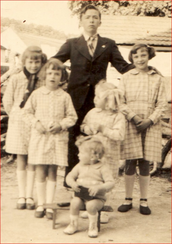 Pentecôte 1939 – Marie-Jo, Thérèse, François, Maguy, Bernadette, et Jean-Claude Champenois (en nourrice) – dans leur cour d’Essert :