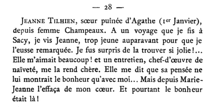 Julien (Julien Sautereau, 1892-1972), il parait que c’est tante Marie Sautereau (1888-1978), sa sœur, qui lui avait dit : « tu devrais venir voir Jeannette, elle est bien gentille et elle a bon caractère ». Bon. C’est un jour qu’elle m’a raconté ça. Julien m’avait dit que si je ne me mariais pas avec lui il en mourrait ! Et quand je me suis confessée à monsieur l’abbé Rousseau je lui ai dit : « je vais être obligée de me marier parce qu’il dit qu’il va mourir ». Qu’est-ce que j’étais enfant ! J’avais dix-huit ans à ce moment-là. Maman avait dit : « je la trouve un peu jeune, il faudrait attendre ». Alors il a attendu, bien sagement, n’est-ce pas. Il venait faire sa cour. Une fois maman lui dit : « mais vous venez bien tard ! ». Et lui il dit : « Eh bien, j’étais allé faire des courses à Vermenton et mon vélo m’a ramené directement à Essert, sans que je le veuille ». Tellement il était épris ! Alors moi ça me faisait un peu drôle, parce que moi je l’aimais… raisonnablement ! Parce qu’il était gentil, il était délicat, et tout… Et moi je me suis mariée comme une enfant. Absolument. Mais c’est extraordinaire ! Et puis après j’ai eu mes enfants, et puis ma foi je les ai élevés de mon mieux, quoi ! On était très… comment dirais-je ? Très chrétiens, dans notre génération. Dans notre pays, quoi.