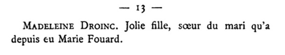 Rétif de la Bretonne Célèbre « Madeleine DROINC » dans son calendrier le 13 janvier 1744. Elle est la sœur de Jean DROIN, mari de Marie FOUARD.