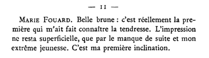 « A parler sincèrement, je crois que j’aimais la seule Marie Fouard … Mais peut-on avoir de l’amour, à l’âge que j’avais alors ? Je le crois ; car j’ai senti un trouble secret, à la vue de Marie ; je l’ai trouvée la beauté qui était d’accord avec mon cœur. »