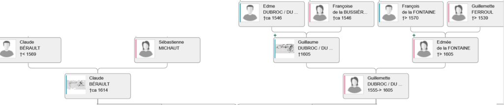L’acte du 11 avril 1570 ci-après, rassemble « honorable homme Claude BÉRAULT marchand à Auxerre » donc Claude BÉRAULT (2) avec « noble homme maître Guillaume DUBROC seigneur des Granges », Edmée de la Fontaine et son père « noble homme François de la FONTAINE ». Nous savons que Claude BÉRAULT (2) a épousé avant le 26 juillet 1571 Guillemette DUBROC fille de Guillaume DUBROC. Edmée de la FONTAINE est la femme dudit Guillaume DUBROC.
