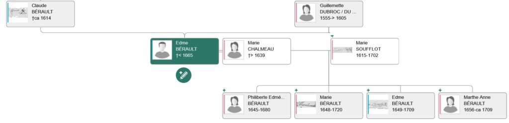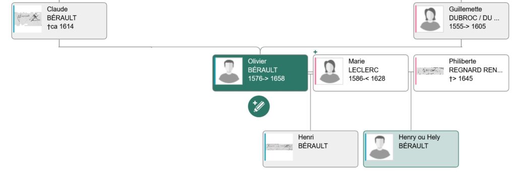 Henry BÉRAULT fils du premier mariage d’Olivier, sera deux fois parrain à Sacy en 1625, dont une fois pour un enfant BÉRAULT. Il sait signer, il est déjà adulte, ce qui le différencie de son demi-frère.