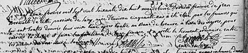 « Le vingt deux fevrier mil sept cents soixante dix huit magdeleine Droin femme de jean Berault de cette paroisse de Sacy, agée d’environ cinquante ans, a été élûe par les femmes qui lui ont toutes donnés leur voix l’une apres l’autre, au Banc de l’oeuvre à l’issu des vespres, pour exercer la charge et faire les fonctions de Sage femme, et a prêté le serment ordinaire entre les mains de moi Curé soussigné. » Signé : Berault [note : recteur des écoles], Jacquot curé de Sacy