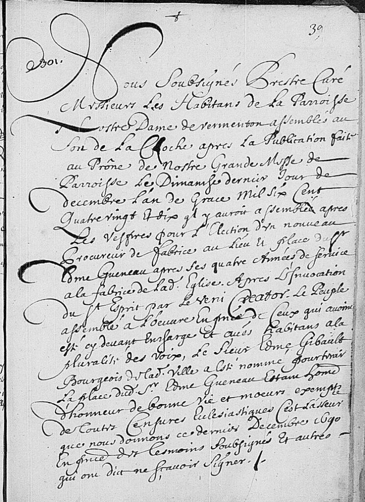 « Nous soubsignés Prestre Curé Messieurs les Habitans de la Parroisse Nostre Dame de Vermenton assemblés au son de la Cloche apre la Publication faite au Prône de nostre Grande Messe de Parroisse le Dimanche dernier jour de Decembre l’an de Grace mil six cent quatre vingt et dix ql [qu’il] y auroit assemblée apres les Vespres pour l’Election d’un nouveau Procureur de fabrice au lieu et place eu Sr Edme Gueneau apres ses quatre Années de service a la fabrice de lad. [ladite] Eglise. Apres l’Invocation du St Esprit par le veni Creator. Le Peuple assemblé a l’oeuvre en pnce [présence] de ceux qui avoint esté cy devant en charge et aux [?] habitans a la pluralité des voix, le Sieur Edme Gibault Bourgeois de lad. Ville a esté nommé pour tenir la place dud. Sr Edme Gueneau estant home [homme] d’honneur de bonne vie et mœurs exempts [« ce » en interligne?] de toutes Censures Ecclesiastiques c’est l’asseur que nous donnons ce dernier Decembre 1690 en pnce des tesmoins soubsignés et autres qui ont dict ne sçavoir signer ./. » Aucune signature. [existe-t-il un suite non numérisée?]