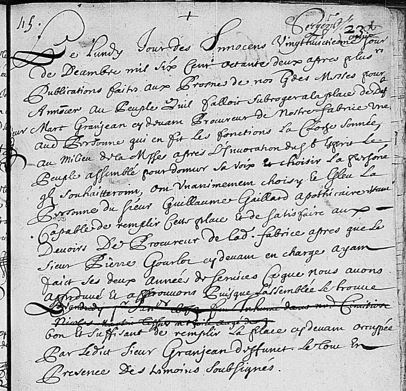 « Le lundy jour des Innocens vingthuictiesme jour de Decembre mil six cent octante deux apres plus[ieu]rs publications faites aux Prosnes de nos G[ran]des Messes pour Anno[n]cer au Peuple quil falloit subroger a la place de def[funct] Sieur Marc Granjean cy devant Procureur de nostre fabrice une aud [autre] Personne qui en fit les fonctions la cloche sonnée, au milieu de la Messe apres l’invocation du St Esprit le Peuple assemblé pour donner sa voix et choisir la person[n]e q[u]ilz souhaitteroint, ont unaniment choisy et eleu [élu] la Personne du sieur Guillaume Gaillard apothicaire estant capable de remplir cette place et de satisfaire aux devoirs de Procureur de lad. [ladite] fabrice apres que le sieur Pierre Gourlot cy devant en charge ayant faict ses deux années de services ce que nous avons approuvé et approuvons puisque l’assemblée le trouve [2 lignes raturées concernant une inhumation] bon et suffisant de remplir la place cy devant occupée par le dict Sieur Grandjean deffunct. Le tout en presence des tesmoins soubsignés. » [aucune signature]