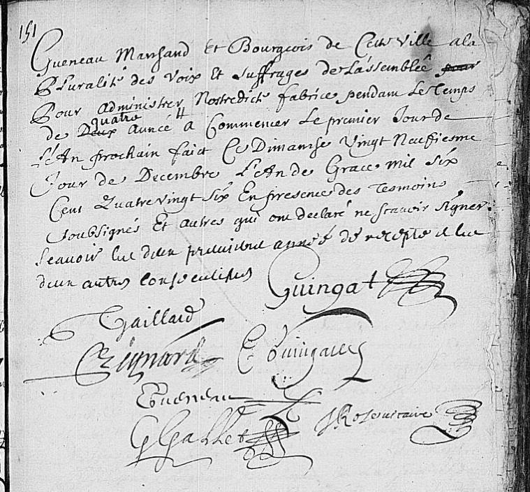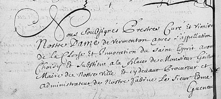 « Nous soubsignés Prestre Curé et Vicaire de Nostre Dame de Vermenton apres l’appellation de la Cloche et Invocation du saint Esprit avons choisy et substitué a la place de Monsieur Gaillard Maire de nostre ville et cy devant Procureur et administrateur de nostre fabrice le Sieur Edme Gueneau Marchand et Bourgeois de cette ville a la pluralité des voix et suffrages de l’assemblée [rature] pour administre nostre dicte fabrice pendant le temps de [« deux » rayé] quatre année # a commencer le premier jour de l’An prochain faict ce Dimanche vingt neufiesme jour de Decembre l’An de Grace mil six cent quatre vingt six en presence des tesmoins soubsignés et autres qui ont declaré ne scavoir signer. # scavoir les deux premieres année de recepte et les deux autres consecutisves » Suivent les signatures.