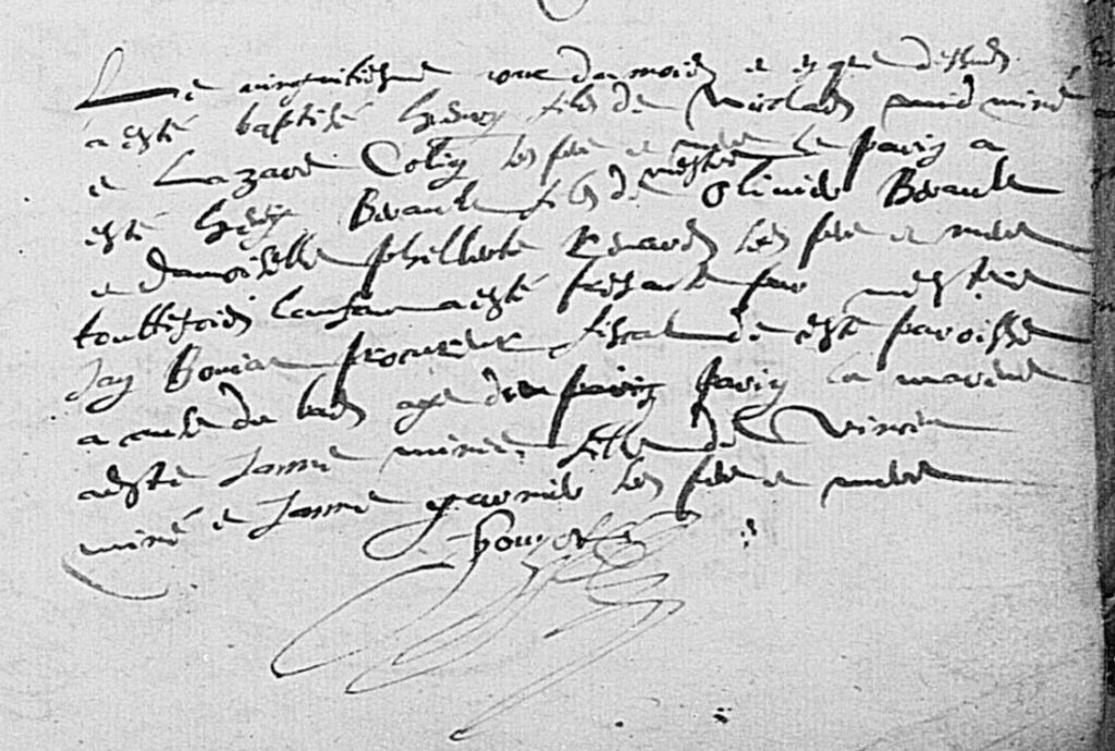 Les registres permettent d’attribuer au couple MINÉ / GARNIER neuf enfants nés de 1605 à 1628 [2 ancêtres].