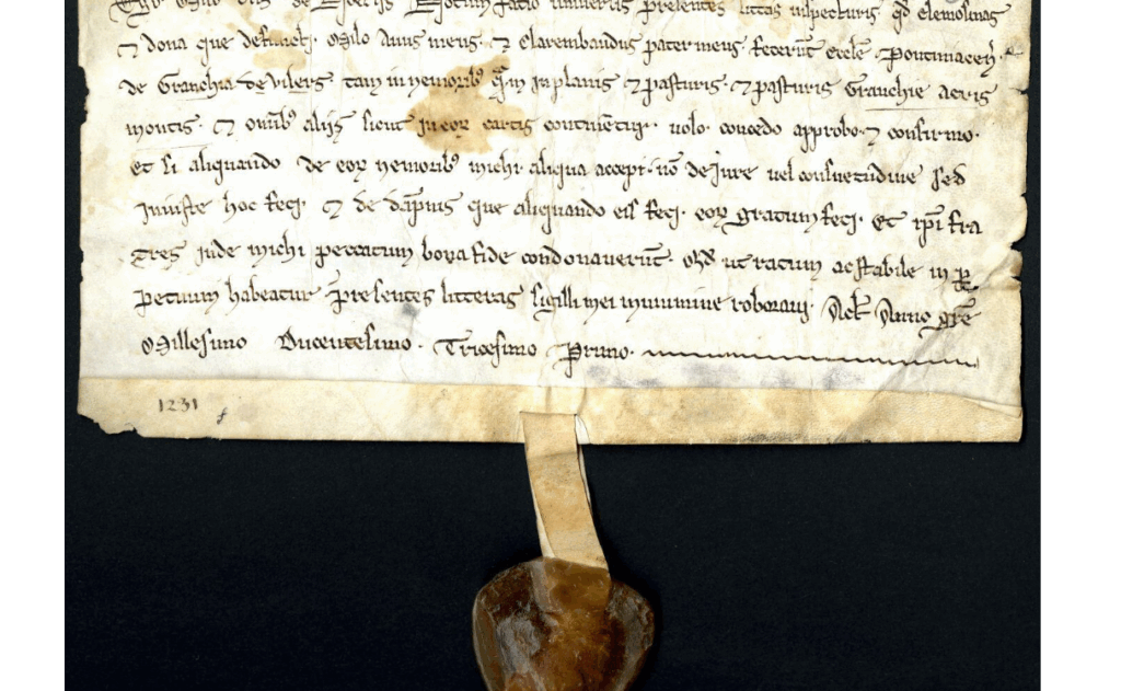 [1] Confirmation par Milon de Noyers de la donation faite à l’abbaye par son aïeul du même nom, et son frère Clairembaut, des métairies de Villiers et d’Aigremont. – 1231