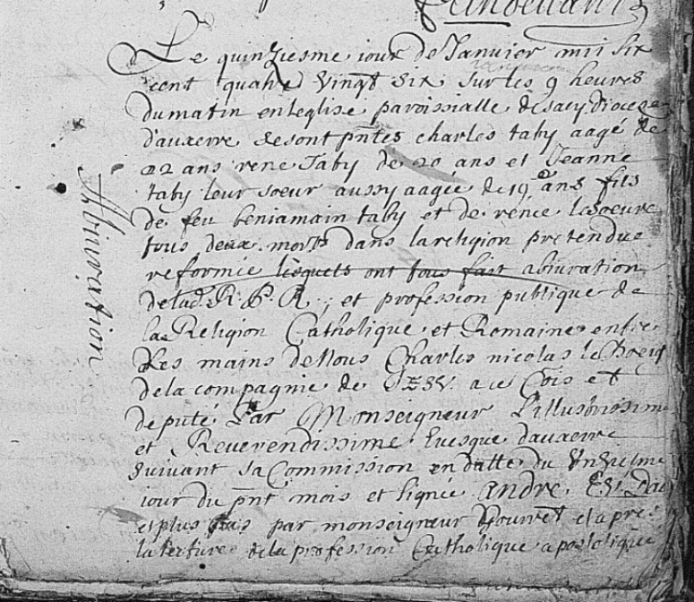 S’il est fait état ici de Mas-Saintes-Puelles , c’est parce que dans l’Yonne, il n’a pas été permis de rencontrer l’équivalent, aucun acte d’abjuration « volontaire » dans les registres paroissiaux. Ils n’ont pu cependant qu’avoir lieu. Où étaient-ils consignés ?