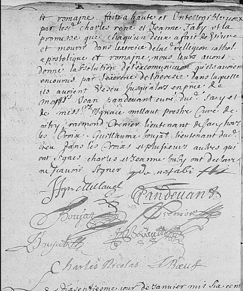 Après la naissance de leur dernier enfant en 1697, Jeanne TABY et son mari, ainsi que leur dernier enfant survivant, disparaissent des registres. Les recherches effectuées via les relevés Geneanet et autres, n’ont pas permis de les retouver, ni en France, ni dans un pays de religion protestante.