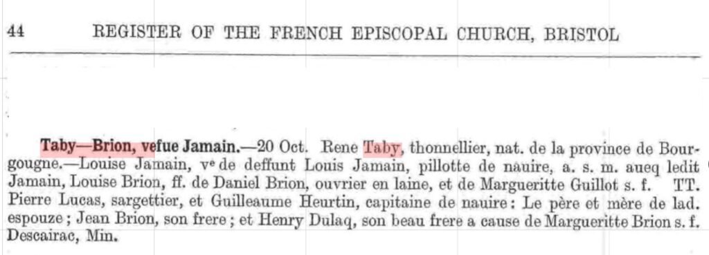 – Pierre TABY fils de Bene [sic] TABY tonnelier et de Louise sa femme, né à Petticoat Lane quartier Est de Londres est baptisé le 11 octobre 1702 en la paroisse de Stepney à Londres.