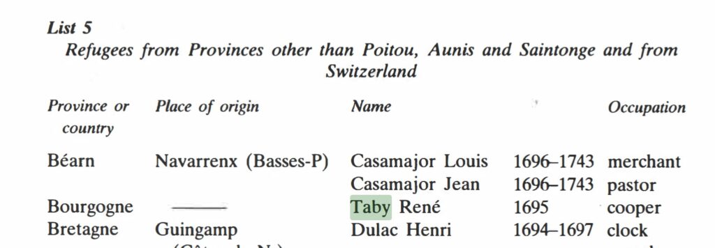 – René TABY fils de René TABY tonnelier et de Louise sa femme de Brick Lane [12] est baptisé en la paroisse de Stepney à Londres le 06 janvier 1706.